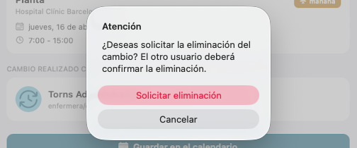 En la pantalla de detalle del cambio de turno, presiona sobre "Eliminar el cambio". Un mensaje de confirmación de alertará de que el otro usuario debe confirmar la eliminación. Presiona sobre "Solicitar eliminación".