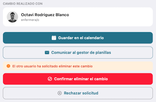 Al seleccionar la opción de eliminar un cambio de turno, este no se eliminará automáticamente. El otro usuario con el que te has hecho el cambio, deberá confirmar la eliminación del cambio de turno.