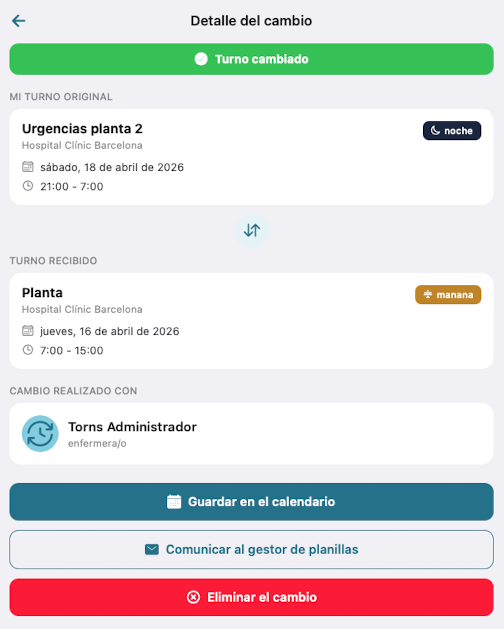 Mostrará toda la información del cambio y las opciones de guardar el turno cambiado en el calendario y comunicar el cambio al gestor de planillas.