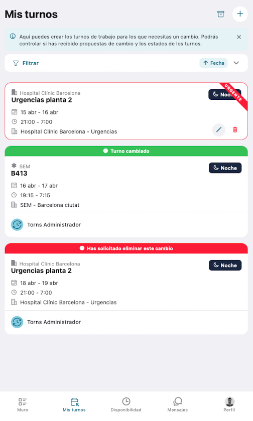 Esta pantalla muestra los turnos que tú hayas creado para cambiar. Son los turnos que necesitas cambiar. Al resto de usuarios, estos turnos se les mostrará en su pantalla Muro.