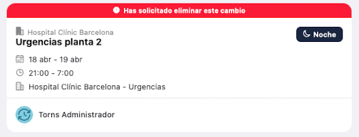 Turno cambiado del que has solicitado la eliminación: muestra una franja superior de color rojo. El turno está pendiente de ser eliminado tras la confirmación por parte del otro usuario.