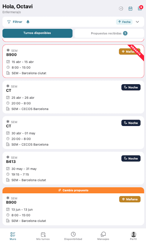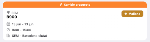 Turno al que has hecho una propuesta de cambio: se muestra con una franja superior de color naranja. Cuando el otro usuario acepte tu propuesta de cambio de turno, este desaparecerá del Muro y ya no estará disponible para ningún otro usuario.
