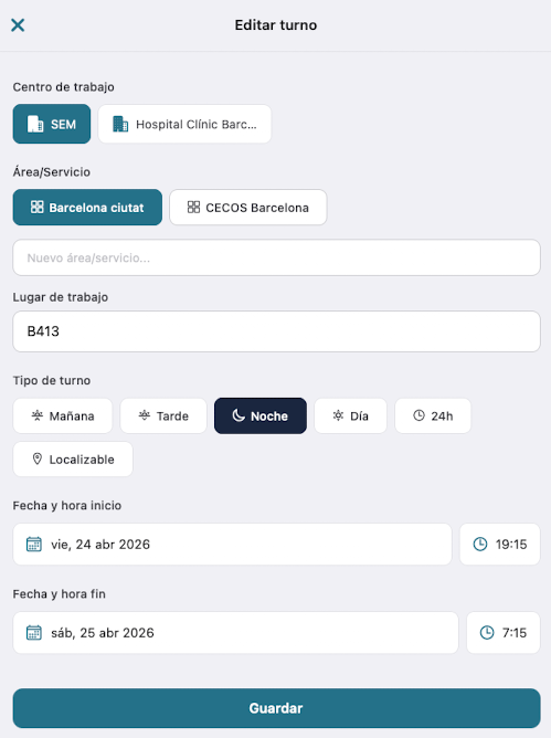 Al presionar sobre el lápiz, acceder a la pantalla de Detalle del turno, dónde podrás modificar los datos que desees. No olvides presionar el botón "Guardar" para que los cambios se apliquen.