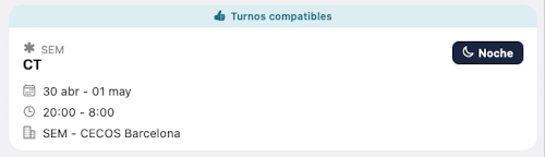 Una vez activado, en el muro verás aquellos turnos que puedes hacer por horario compatible (no tienes nada en tu agenda). Se marcarán los turnos con una franja verde en la parte superior indicando "Turno compatible".