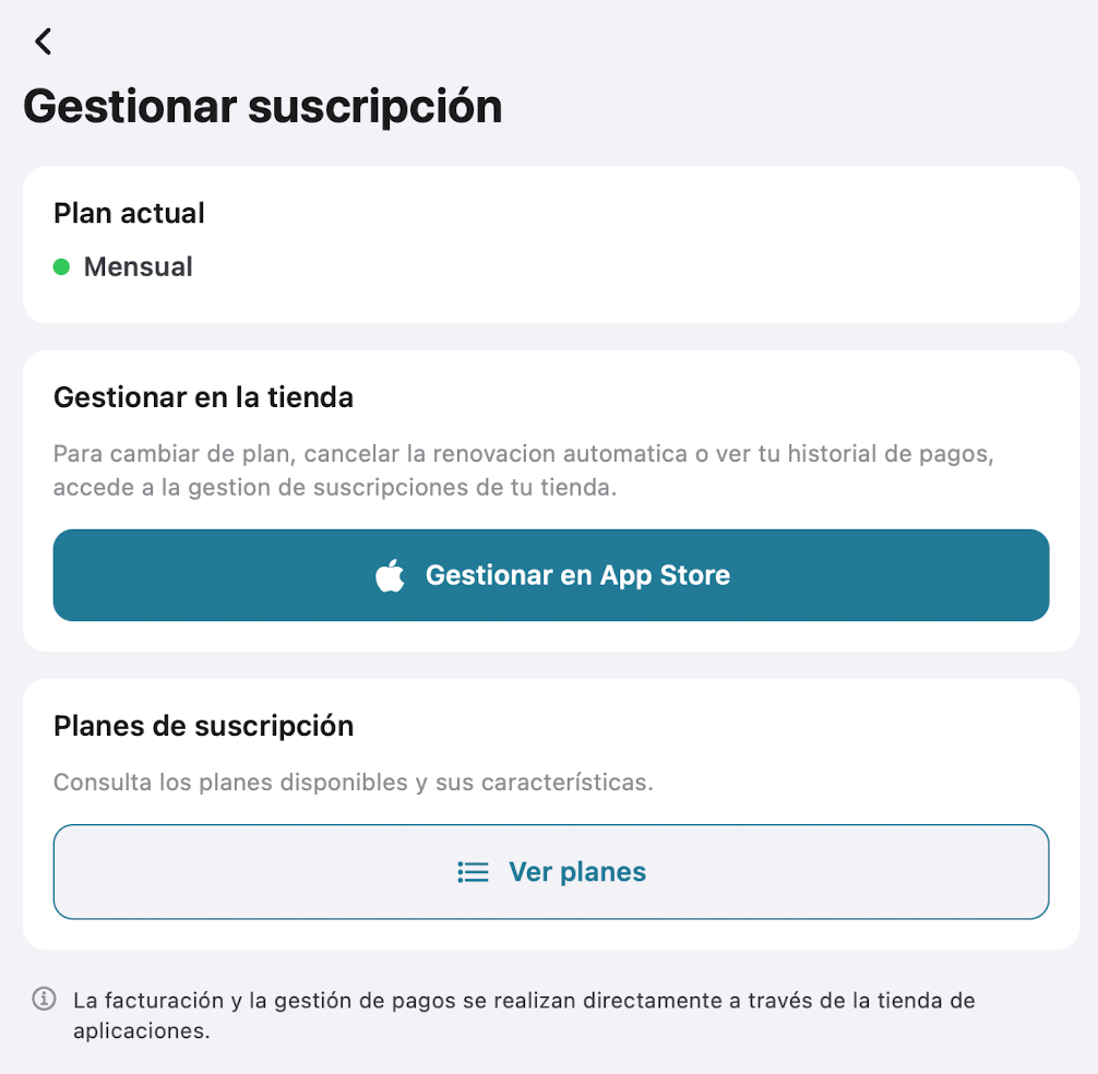 Puedes cambiar de plan seleccionando "Mostrar todos los planes". Se mostrarán los planes de suscripción disponibles para la app y podrás modificarlo desde el AppStore.