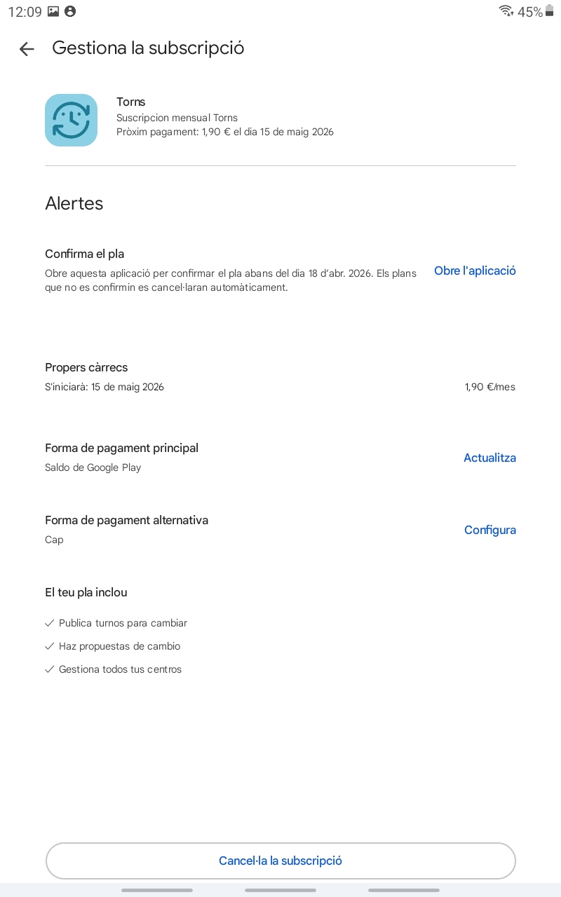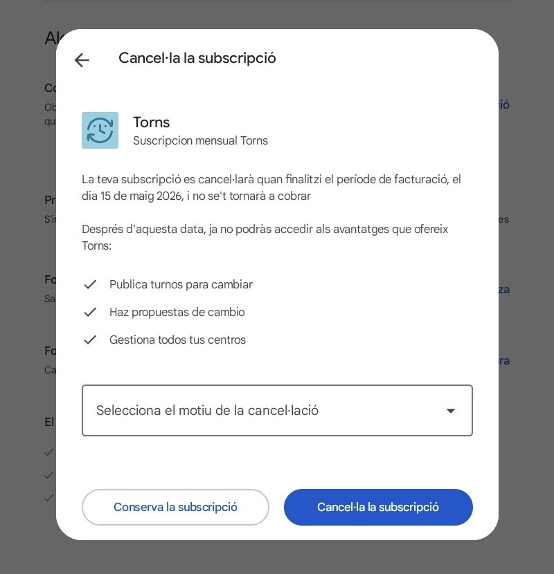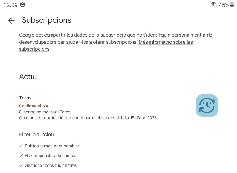 Para gestionar tu suscripción activa en Torns, puedes hacerlo desde tu Perfil o desde tu cuenta en Google Play o Apple Store.